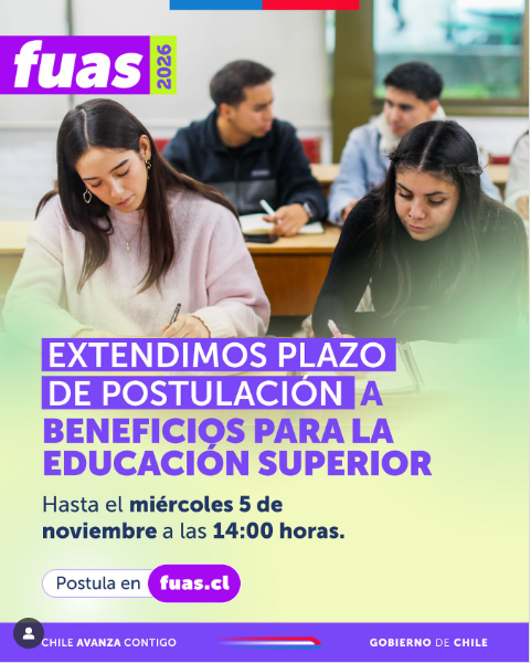 🎓 ¡Extendimos el plazo para postular a gratuidad, becas y créditos hasta el 5 de noviembre! Anótalo en tu calendario y no lo dejes para última hora.
